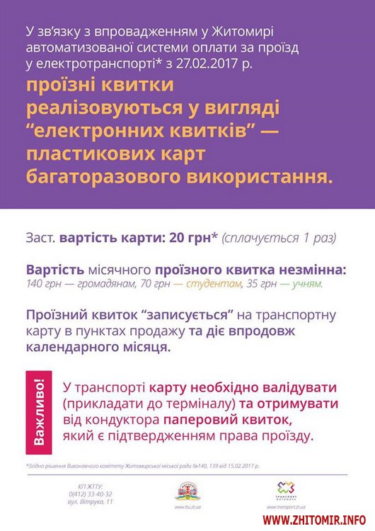 «Відсьогодні в реалізацію у кіосках ЖТТУ надійшов е-квиток. У березні він буде як звичайний проїзний, який потрібно просто пред’являти, однак потім, коли термінали будуть у всьому транспорті, його слід буде валідувати (прикладати до терміналу) та отримувати паперовий квиток. Із квітня свій е-квиток потрібно буде «поповнювати» у точках продажу ЖТТУ». – пояснив Фурлет.