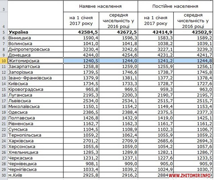 «Станом на 1 січня 2017 року загальна кількість осіб, яка проживає на території Житомирської області становить 1 млн 240 тис. 482 особи. У порівнянні з минулим роком, населення області зменшилося. Так, станом на 2016 рік у Житомирській області проживало 1 млн 247 тис.549 осіб. Станом на початок року в Житомирі проживає 267 тисяч 363 особи, у Бердичеві – 76 тисяч 711 осіб, у Коростені – 64 тисячі 256 осіб, Малині – 26 тис. 484 особи та у Новограді-Волинському – 56 тисяч 316 осіб», - повідомляють статисти.