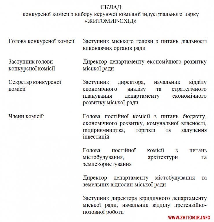 «З метою відбору на конкурсних засадах керуючої компанії індустріального парку «ЖИТОМИР-СХІД» шляхом організації і проведення відкритого конкурсу, відповідно до Закону України «Про місцеве самоврядування в Україні», Закону України «Про індустріальні парки», рішення Житомирської міської ради від 06.09.2016 №331 «Про внесення змін до рішення міської ради №278 від 21.07.2016 р.», міська рада вирішила організувати та провести конкурс з вибору керуючої компанії індустріального парку «ЖИТОМИР-СХІД». Затвердити Положення про умови конкурсу з вибору керуючої компанії індустріального парку «ЖИТОМИР-СХІД» згідно з додатком 1. Затвердити склад та порядок роботи конкурсної комісії з вибору керуючої компанії індустріального парку «ЖИТОМИР-СХІД» згідно з додатком 2. Уповноважити конкурсну комісію, вказану в пункті 3 цього рішення, вживати всіх необхідних організаційних дії для організації та проведення конкурсу з вибору керуючої компанії індустріального парку «ЖИТОМИР-СХІД». Уповноважити міського голову підписати договір про створення та функціонування індустріального парку «ЖИТОМИР-СХІД» з керуючою компанією вибраною згідно з чинним законодавством України», - зазначається у проекті.