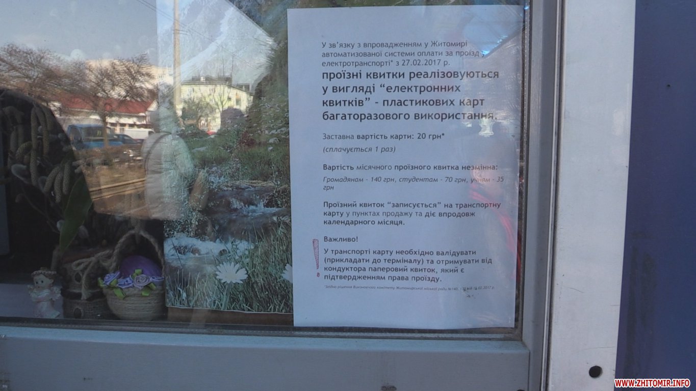 Від учорашнього дня у Житомирі можна придбати багаторазовий електронний проїзний, який є прототипом електронного квитка. Ціна такого проїзного залишилась незмінною, але пасажирам доведеться додатково сплатити 20 гривень – це заставна вартість карти. За словами чиновників міської ради, тепер кожен, хто придбав електронний проїзний, може самостійно без допомоги кондуктора провалідувати свою поїздку.