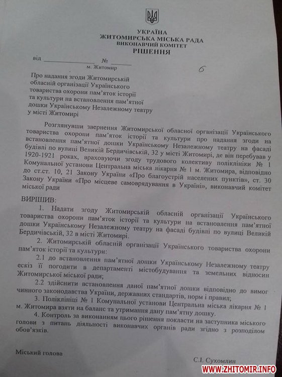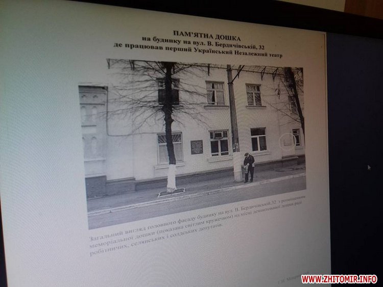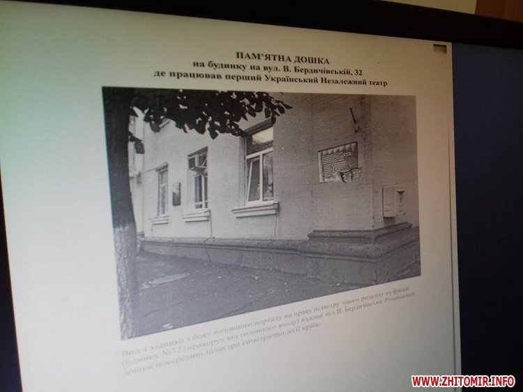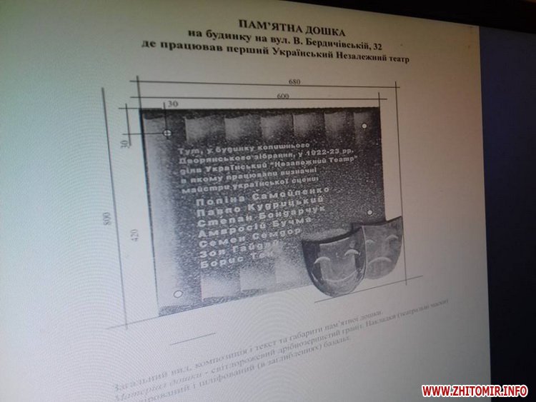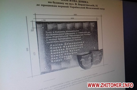 Виконком Житомирської міської ради не надав згоди обласній організації Українського товариства охорони пам’яток історії та культури на встановлення пам’ятної дошки Українському Незалежному театру на фасаді будівлі по вулиці Великій Бердичівській, 32.