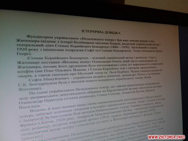 «Фундатором українського «Незалежного театру» був наш земляк родом із під Житомира, видатний український актор і театральний діяч Степан Бондарчук. Заснований у серпні 1920 року з ініціативи подружжя Софії та Степана Бондарчуків. Театр очолювали брати Георгі. [...] На сцені українського Незалежного театру, що займав приміщення колишнього залу дворянського депутатського зібрання на Бердичівській вулиці, виступали актори Олександр Перегуда, Семен Семдор, Василь Васильєв. [...] Український Незалежний театр у Житомирі припинив свою роботу у 1923 році»,– йдеться в довідці краєзнавця Георгія Мокрицького.