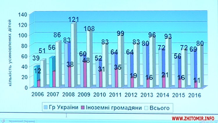 «У нас було в області усиновлено 972 дитини. З них 695 громадянами України і 277 іноземними громадянами. Усиновлено дітей: громадянами США – 134 дитини, 81 дитина громадянами Італії, 26 – Іспанії, 23 – Франції, по декілька дітей по іншим країнам. Тільки одна дитина була усиновлена в 2011 році в країну Тринідад і Табаго», – розповідає начальник служби у справах дітей Житомирської облдержадміністрації Олена Савельєва.