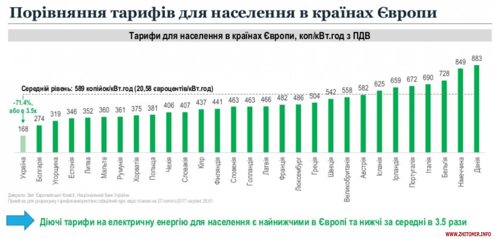 Як повідомляв Житомир.info, на початку лютого цього року ПАТ «ЕК «Житомитробленерго» опублікувало інформацію про останній етеп підвищення тарифів на електроенергію: відповідно до нових тарифів, якщо споживач використовує до 100 кіловат, то він платитиме на 26% більше – 90 коп. за 1 кВт (було 71,4 коп.), за обсяг, спожитий понад 100 кВт·год. електроенергії, треба буде заплатити 1 грн 68 коп. Раніше було розділення тарифів на обсяги 101-600 кВт (1 грн 29 коп.) та більше 600 кВт (1 грн 63,6 коп.), з 1 березня такий розділ не діятиме.