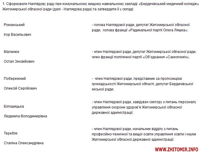 «Повноваження членів Наглядової ради дійсні 2 роки з моменту підписання даного розпорядження, відповідно до вимог Положення про Наглядову раду комунальних підприємств та установ Житомирської обласної ради, затвердженого рішенням обласної ради від 19.05.16 №244 «Про затвердження Положення про Наглядову раду». Контроль за виконання розпорядження покласти на робочу групу по формуванню наглядових рад комунальних підприємств та установ Житомирської обласної ради», - йдеться у документі, опублікованому на сайті облради.