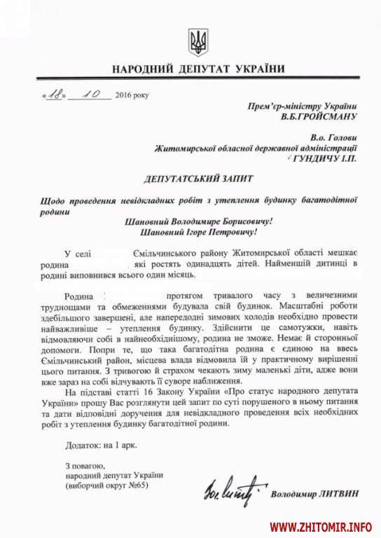 На другому місці по кількості запитів нардеп від Новоград-Волинського округу Володимир Литвин (група «Воля народу») – 12 запитів до місцевих органів влади. Зокрема, в жовтні минулого року народний депутат звертався до керівника ОДА Ігоря Гундича щодо проведення невідкладних робіт з утеплення будинку багатодітної родини в Ємільчинському районі.