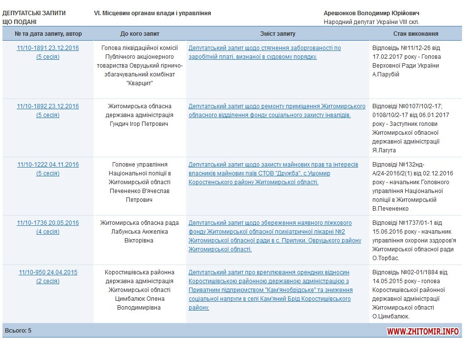 З початку каденції п’ять депутатських запитів направив місцевій владі представник Коростенського округу Володимир Арешонков (Блок Петра Порошенка), причому один із запитів стосувався Коростишівського району, який не входить в округ народного обранця.