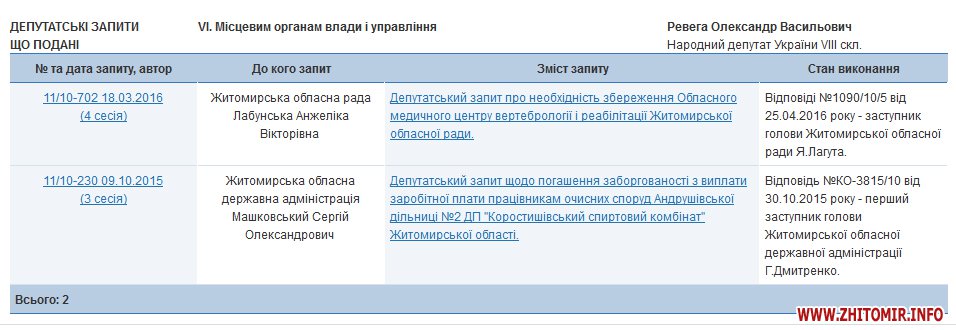Два запити направляв ще один член фракції БПП – Олександр Ревега (Бердичівський округ): голові ОДА щодо погашення заборгованості з виплати зарплати і голові обласної ради про необхідність збереження обласного медичного центру вертебрології і реабілітації.