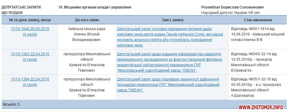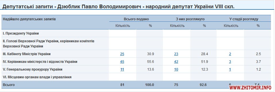 На сайті Верховної Ради немає інформації про запити місцевим органам влади, які направив нардеп від Малинського округу Павло Дзюблик (Народний фронт).