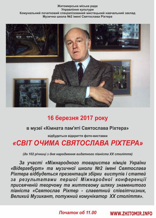 Крім того, мерія Житомира спільно з управлінням культури та музшколою №2 ім. С. Ріхтера запрошує на відкриття фотовиставки "Світ очима Святослава Ріхтера", яка відбудеться 16 березня у кімнаті пам'яті видатного піаніста.