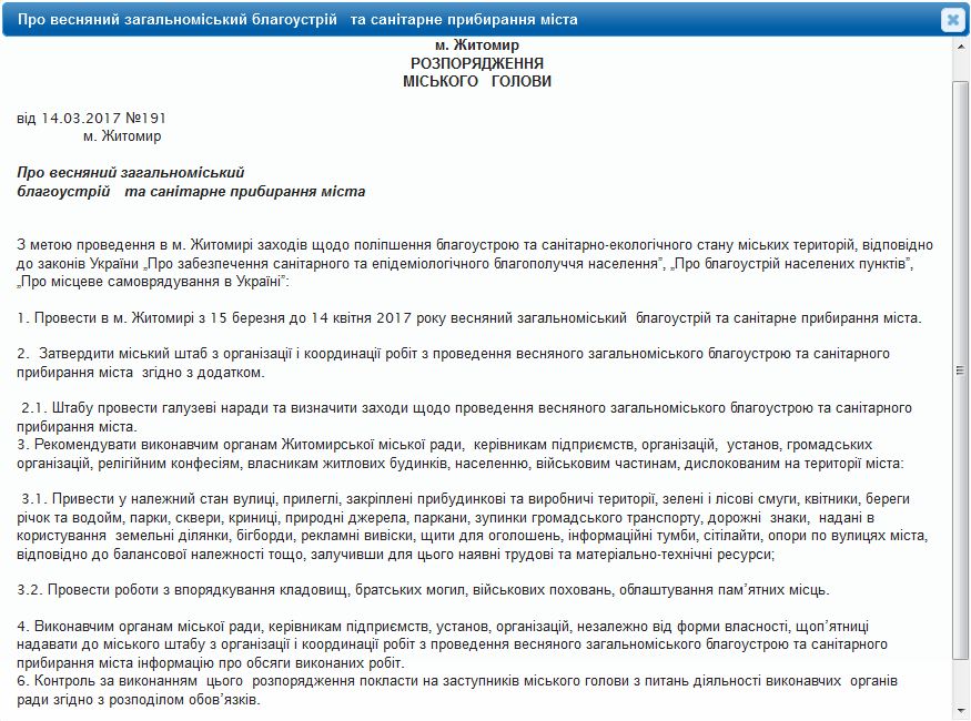 «З метою проведення в м. Житомирі заходів щодо поліпшення благоустрою та санітарно-екологічного стану міських територій, відповідно до законів України «Про забезпечення санітарного та епідеміологічного благополуччя населення», «Про благоустрій населених пунктів», «Про місцеве самоврядування в Україні»: