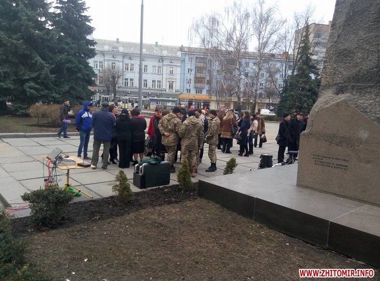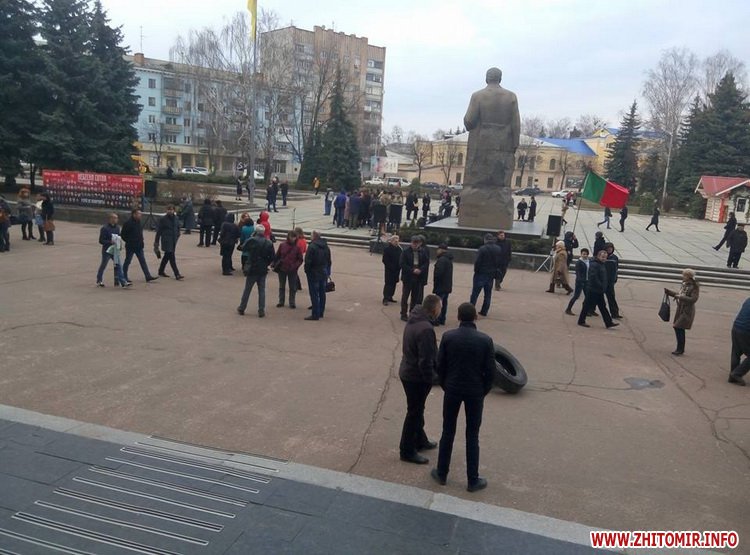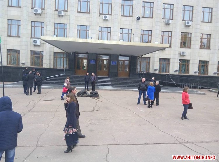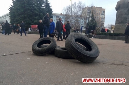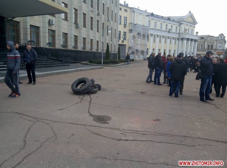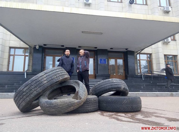 Близько 17:00 під стінами Житомирської ОДА почали збиратися житомиряни, хтось з громадських активістів приніс та залишив під стінами облдержадміністрації шини.
