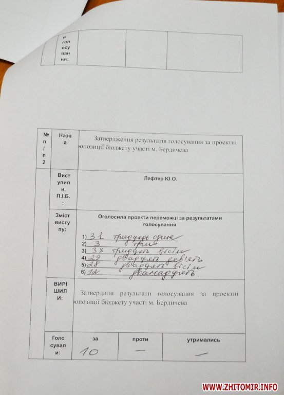 «За проектні пропозиції бюджету участі у Бердичеві проголосували 1892 особи. При цьому у скриньках загалом було 1914 бюлетенів. Із них 22 бланки визнали недійними, оскільки вони суперечили Положенню про бюджет участі: не було належним чином оформлені (не був вказаний номер, час видачі бюлетеня, не було підпису відповідальної особи – волонтера-реєстратора). Узагалі участь у голосування взяли 50 проектів, які були розподілені за шістьма районами міста. У кожному районі у нас тепер є переможець. Так, у районі «М’ясокомбінат» переміг проект №31 «Відродження парку», набравши 1036 голосів. Це – благоустрій парку району шкіроб’єднання. У районі №2 «Корніловка» переміг проект №3 «Красивому місту – достойний вигляд», набравши 990 голосів, він стосується благоустрою озера біля цукрово-рафінадного заводу. У третьому районі «Загребелля» переміг проект №38 «Екоплатформа» – це благоустрій і реконструкція ботанічного саду. За нього проголосувало 819 бердичівлян. У районі №4, на Червоній горі, переміг проект №29 «Захистити дітей від автомобіля», набравши 680 голосів, – це проект про безпеці пішоходів, тобто його автори пропонували облаштувати перехід на 12-ту школу. Центр міста у нас був поділений на два райони – там було подано найбільше проектів (до голосування допусти 33 проектних пропозиції, – ред.). Перемогли 28-й, що стосувався облаштування спортивного майданчика на території НВК №10. Також у «Центрі» переміг ще один проект, під номером 12, – він називається «Могила прадіда рятуй від забуття» і пов'язаний із благоустроєм польського цвинтаря. Ці проекти набрали 413 і 916 голосів відповідно», – прокоментувала Лефтер.