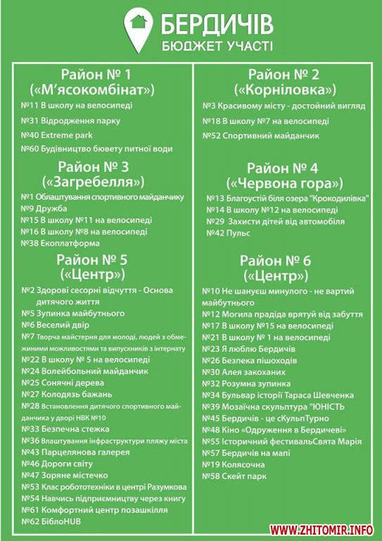 Як повідомляв Житомир.info, прийом проектних пропозицій до бюджету участі у Бердичеві стартував 23 листопада 2016 року та тривав до 1 лютого 2017 року. За цей час жителі райцентру подали до міськради 66 проектних пропозицій.