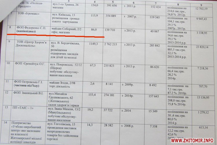 Перший об’єкт - нежитлове приміщення за адресою: м. Житомир, майдан Соборний, 2/2, приватизоване 16 березня 2017 року ФОП Федоренко С.П. Ціна продажу 288 031 грн 20 коп. ( в т.ч. ПДВ – 48 005 грн 20 коп.). У документах дане приміщення вказане як офіс, магазин у напівпідвальному приміщенні площею 86 кв. м. Вартість одного квадратного метра становить 3349,1 гривні.