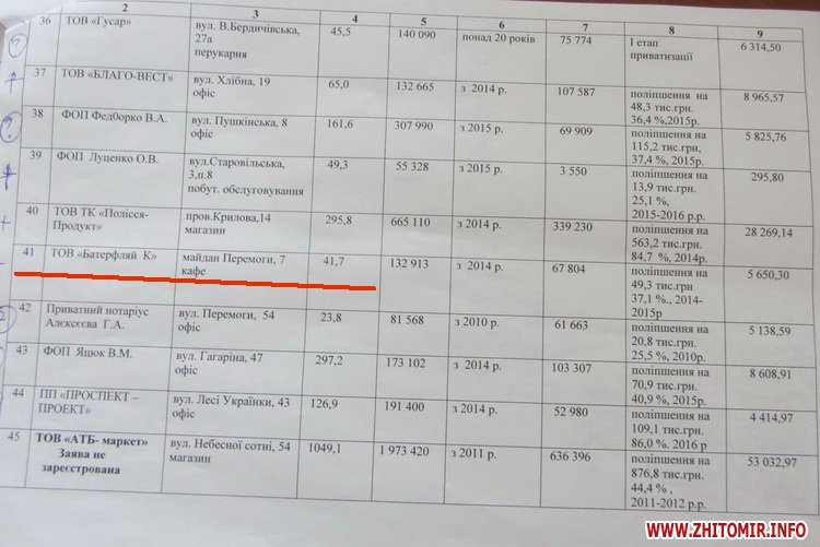 «Нежитлове приміщення за адресою: м. Житомир, майдан Перемоги, 7 приватизоване 14 березня 2017 року товариством з обмеженою відповідальністю «Батерфляй К». Ціна продажу 414 481 грн 20 коп. ( в т.ч. ПДВ – 69 080 грн 20 коп.)», - повідомляє мерія.