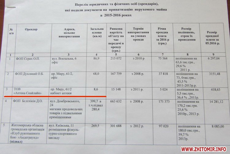 Нежитлове приміщення площею 8,6 квадратних метра за адресою: м. Житомир, проспект Миру, 61/2, приватизоване 17 березня 2017 року товариством з обмеженою відповідальністю «Аптека «Скайлайн», викупили за 60 360 грн 00 коп. ( в т.ч. ПДВ – 10 060 грн 00 коп.). Ціна квадратного метра склала трохи більш як 7 тисяч гривень.