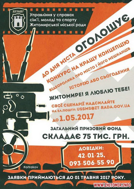 Міськрада повідомляє, що в місті оголошений старт прийому концепцій на щорічний конкурс відеороликів «Житомире! Я люблю тебе!». Конкурс проводиться з метою патріотичного виховання молоді та формування позитивного іміджу міста.
