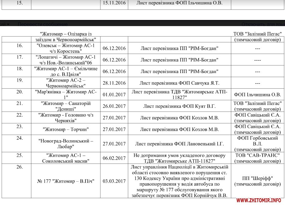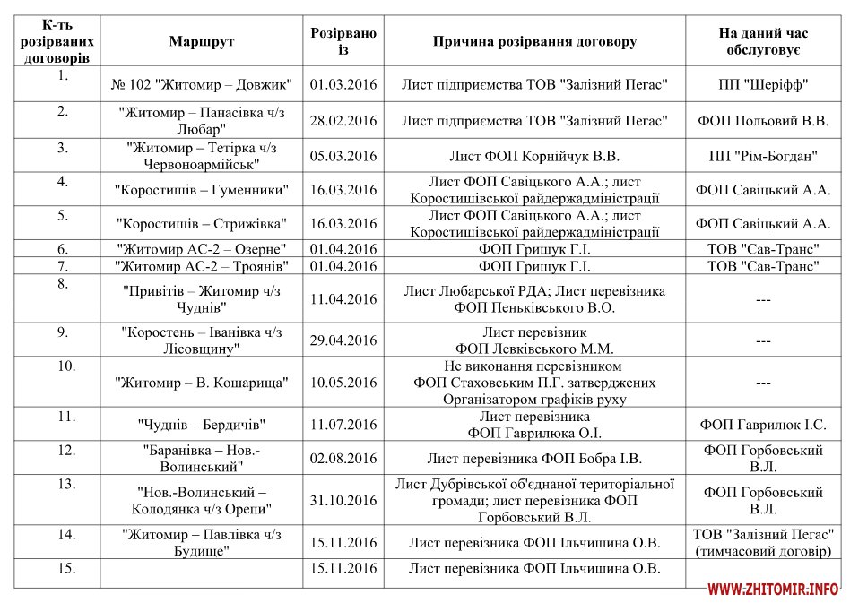Як повідомляв Житомир.info, на початку лютого в Житомирській ОДА визначили тимчасового перевізника, котрий протягом наступних трьох місяців обслуговуватиме приміський маршрут №110 «Житомир – Сонячне – Соколовський масив», на якому 23 січня загинув пасажир. 24 лютого під Житомиром поліція зупинила приміську маршрутку, водій якої мав явні ознаки алкогольного сп’яніння. Пізно ввечері 24 лютого голова Житомирської ОДА Ігор Гундич, через інцидент з п’яним водієм №177 маршруту, обіцяв розірвати договір з перевізником. 27 лютого начальник управління промисловості, розвитку інфраструктури та туризму Роман Крисюк у коментарі повідомив, що з перевізником маршруту №177 Житомирська ОДА вже розірвала договір і шукає нового. На початку березня в ОДА повідомили про розірвання договору з перевізником ФОП Савчук Я.Т., що працює на маршруті № 123 «Житомир – Давидівський масив».