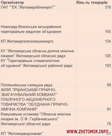 На третьому місці – комунальне підприємство «Житомиртеплокомуненерго» міської ради, яке з початку року результативно провело 134 тендери.