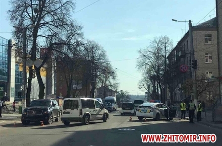 У Житомирі 2 квітня близько 17:00 біля магазину «Еко-маркет», що по вулиці Леха Качинського, сталася ДТП за участю іномарки Infiniti та автомобіля патрульної поліції.