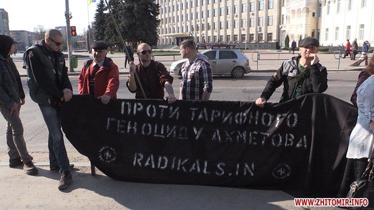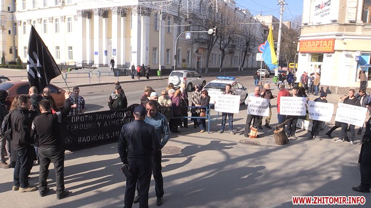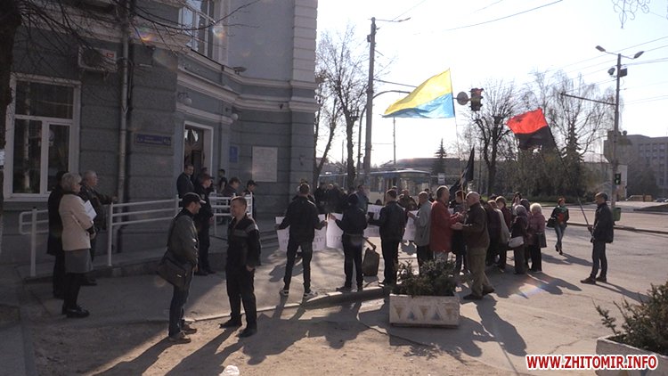 Як повідомляв Житомир.info, перед сесією Житомирську міську раду пікетували активісти з плакатами, прапорами та сокирою.