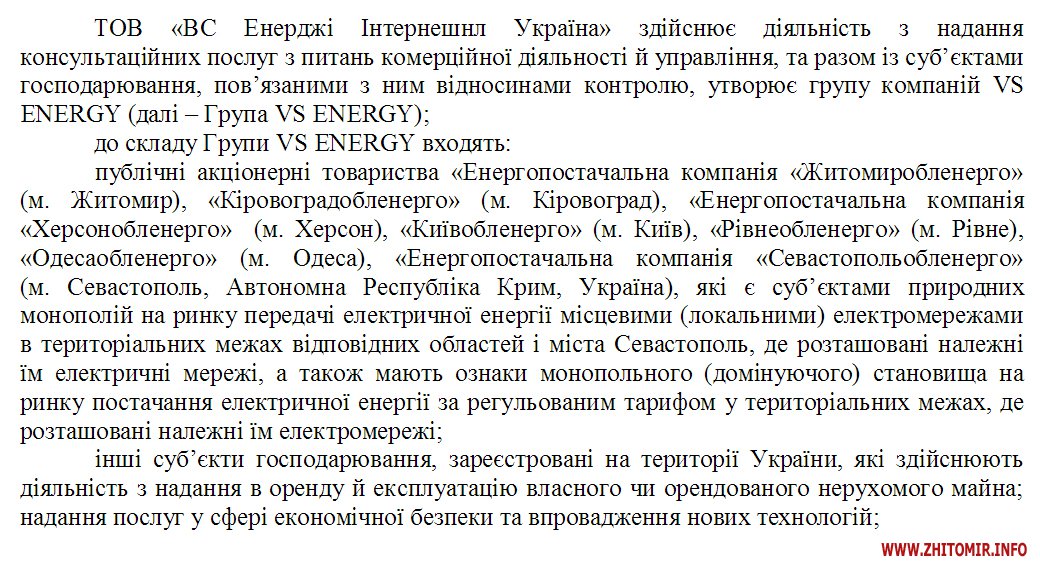 «VS Energy» належить вісім енергопостачальних підприємств України, в тому числі й ПАТ «ЕК «Житомиробленерго».