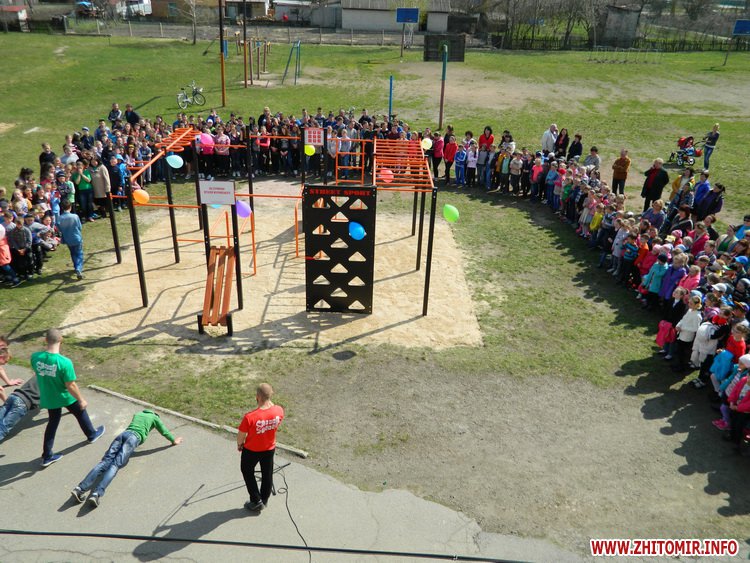 На свято зійшлася вся школа. Розпочав відкриття спортивного майданчику архієпископ Української Православної Церкви Нікодим. У молитві він просив у Бога, щоб оберігав дітей від травм на спортивному комплексі. Після того, як меценат урочисто перерізав стрічку, розпочалося, власне, саме святкування. Були запрошені спеціальні гості – переможці чвертьфіналу телешоу “Україна має талант”, Новоград-Волинська команда зі стріт-воркауту “Strong Spirit”. Хлопці показали дітям неперевершений майстер-клас із трюками на турніках. Школярі були у захваті. По закінченні виступу гості залучили до дійства і самих дітей – провели спортивні міні-змагання. Перший конкурс був проведений серед хлопців і називався “Планка”. Другий – для дівчаток, зі своєрідною назвою “Стілець”. Та найважчим був третій конкурс, тому участь у ньому брали лише найсильніші хлопці школи – підтягування на нових турніках. У кожному з конкурсів визначалася трійка переможців, яких нагородили дипломами та призами. Подарунком за перше місце став набір для настільного тенісу, за друге – напульсники, а за третє – еспандер.