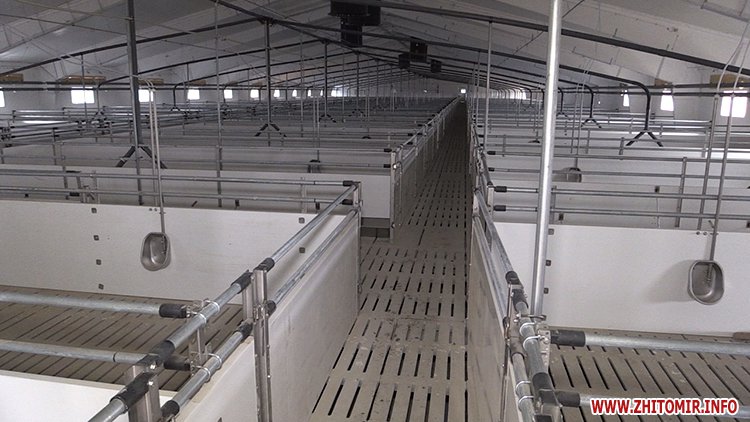 Далі ідемо дивитися в яких умовах живуть свині. Всередині свинарник поділений на загони, в які автоматизовано подається вода та корм. Під спеціальною підлогою облаштована каналізація, а величезні витяжки забезпечують якісну вентиляцію, відповідно - чисте повітря в приміщенні. Загалом, на комплексі має бути 10 таких свинарників.
