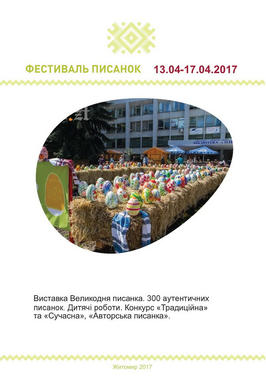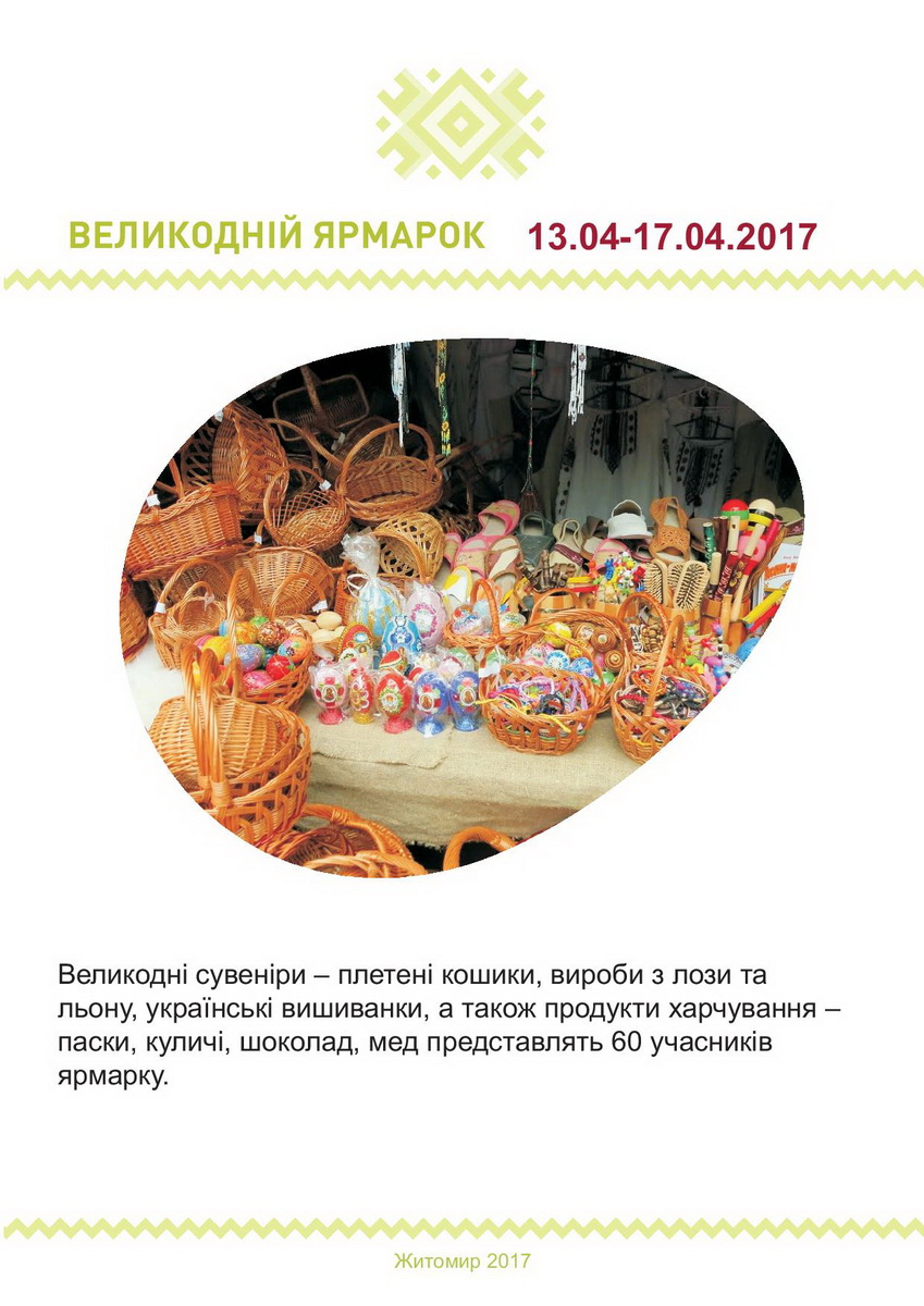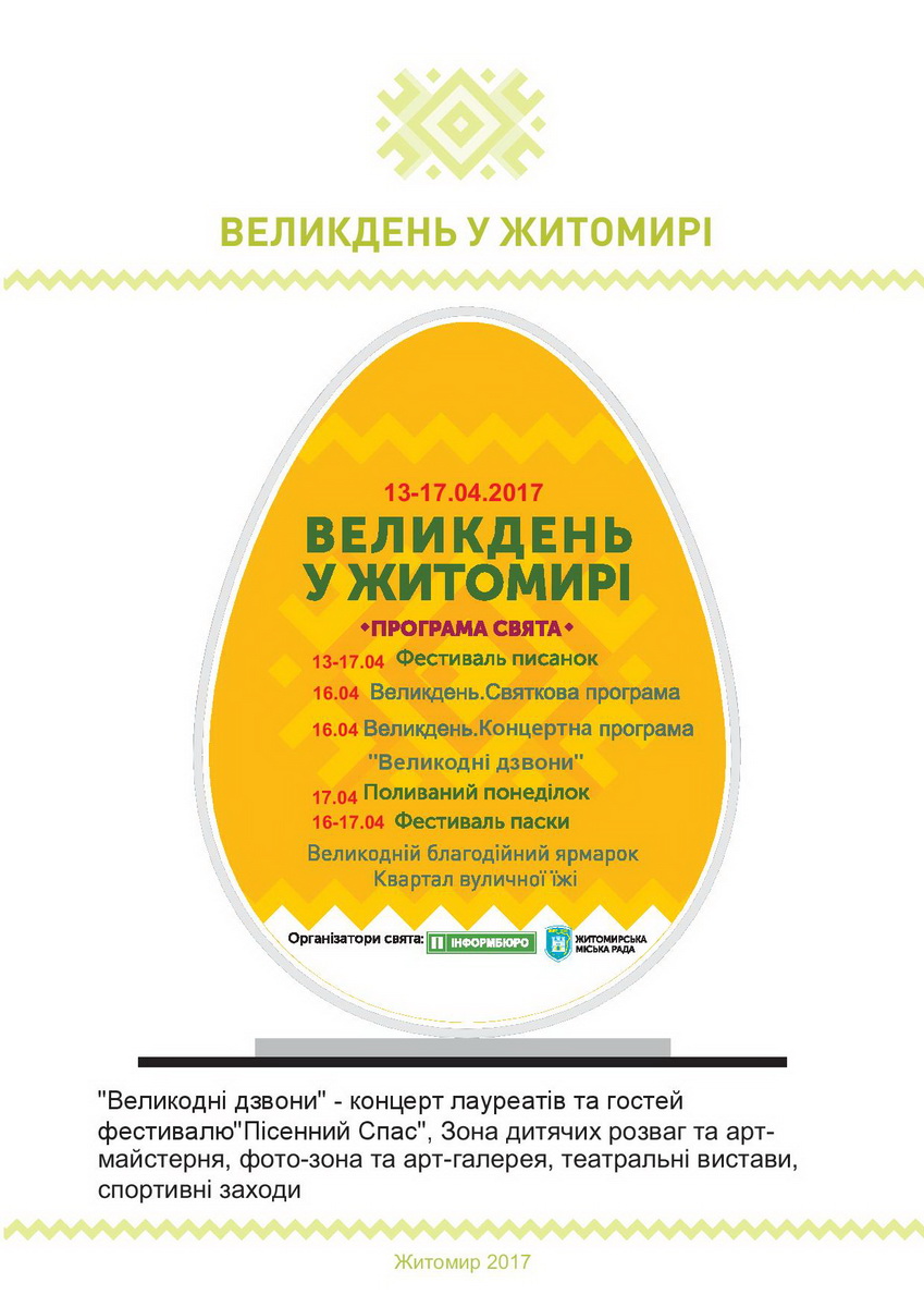 Святкові заходи з нагоди Великодня у Житомирі цьогоріч триватимуть упродовж 13-17 квітня. Упродовж цього часу в місті зокрема відбуватиметься Великодній ярмарок.