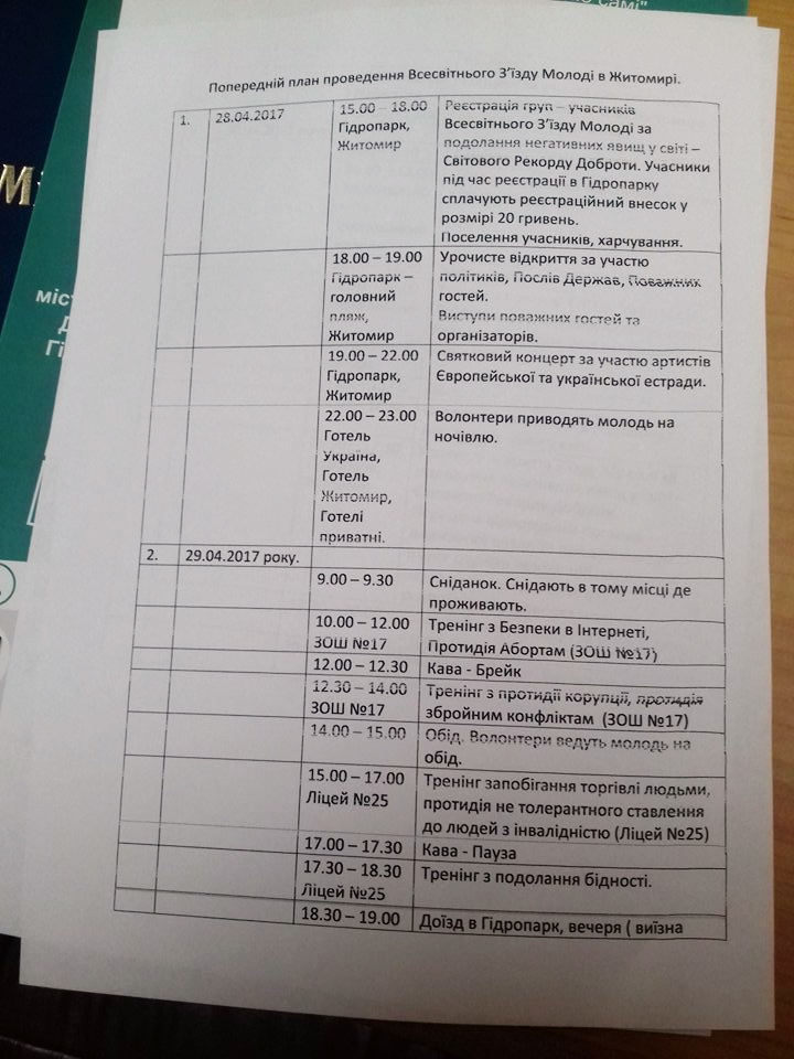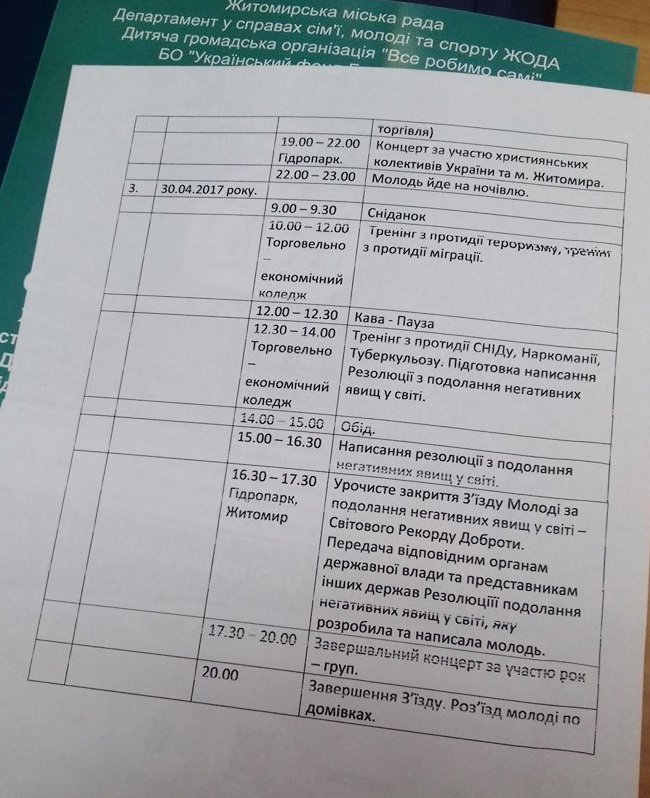 «Ще з липня минулого року ми, БО "Український фонд Благодійництва", ГО "Все робимо самі" та БО "Разом за життя", вирішили провести всесвітній з'їзд молоді за подолання негативних явищ. Таким чином ми хочемо подивитися, чи зможемо ми з представниками з інших країн злагоджено працювати в цьому напрямку. Є 12 тем, які ми хочем обговорити. У з'їзді братимуть участь молоді люди з Німеччини, Чехії, Польщі, Естонії, країн Африки та з багатьох регіонів України. На жаль, приїде не стільки молоді, як ми планували, з різних причини – це і брак фінансування, немає можливості багато людей розмістити. на сьогодні є зареєстрованих 700 учасників. Також ми заоохочуємо молодь міста Житомира активно долучатися. 28 квітня о 18:00 відбудеться офіційне відкриття з’їзду за участю міністра молоді та спорту України Ігоря Жданов, а також послів інших держав», - уточнив Купчинський.