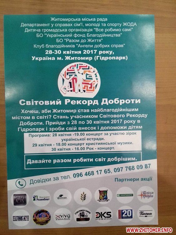 Також він додав, що у квітні минулого року місто Житомир стало найблагодійнішим містом України. Тоді вдалосчя зібрати понад 200 тис. грн. Цьогоріч організатори мають на меті встановити аналогічний всесвітній рекорд, зібравши кошти на допомогу трьом категоріям дітей: онкохворим, дітям із інвалідністю та з ВІЛ.