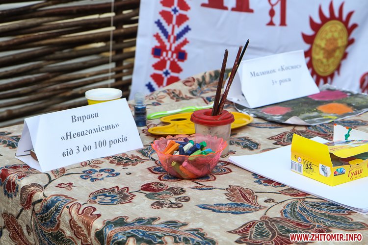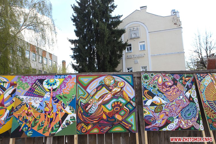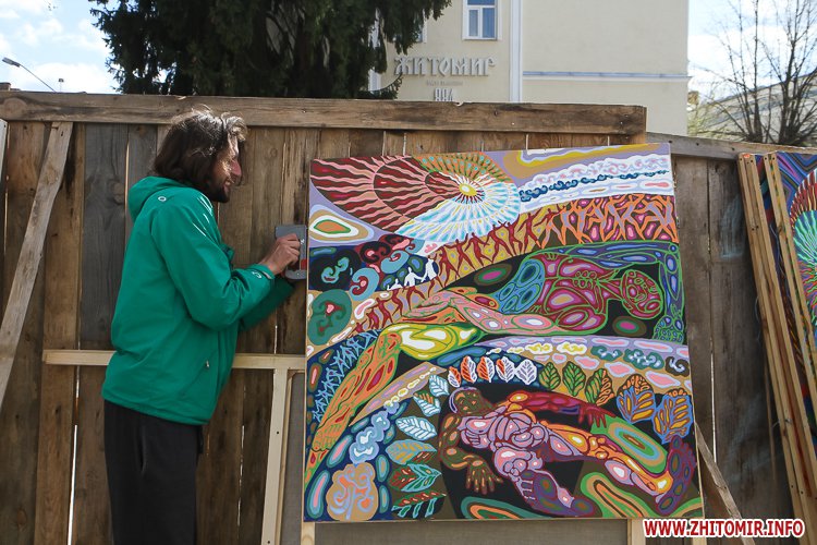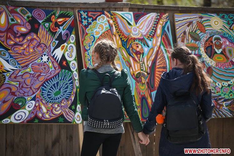На паркані – кольорові полотна, від розуміння суті яких перехоплює дух, на тротуарі – яскраві розкладки та ігрові локації, поміж відвідувачів - майстер взуття із конопель, співорганізатор арт-фестивалю Олег Земнухов. Працює фотозона.
