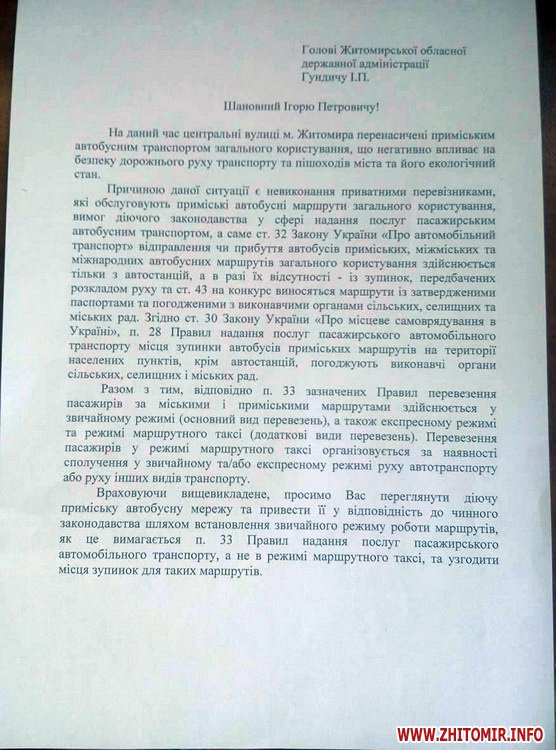 «Просимо Вас переглянути діючу приміську автобусну мережу та привести її у відповідність до чинного законодавства шляхом встановлення звичайного режиму роботи маршрутів, як це вимагається п. 33 Правил надання послуг пасажирського автомобільного транспорту, а не в режимі маршрутного таксі, та узгодити місця зупинок для таких маршрутів», - зазначається у зверненні.