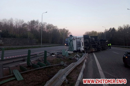 «20 квітня близько 21:50 на 107 км автодороги Київ-Чоп у районі села Царівки Коростишівського району Житомирської області сталася дорожньо-транспортна пригода, у результаті якої вантажний автомобіль Renault Magnum перекинувся. За кермом транспортного засобу перебував житель Київщини, 1966 р.н. Вантажівка їхала в напрямку Житомира. Водій був доставлений до реанімаційного відділення місцевої лікарні. Розпочато кримінальне провадження, встановлюються обставини та причини дорожньо-транспортної пригоди», - розповіла Алла Ващенко.