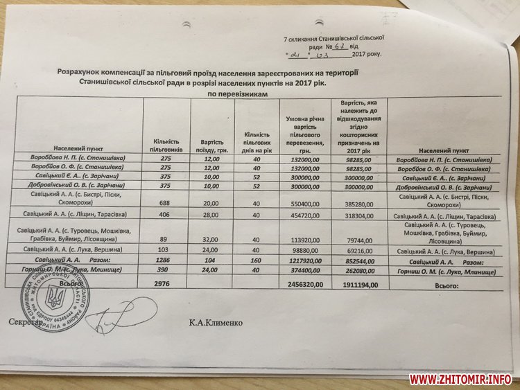 Про це йдеться у розрахунках компенсації за пільговий проїзд населення, зареєстрованих на території Станишівської сільської ради, що є у розпорядженні Житомир.info.