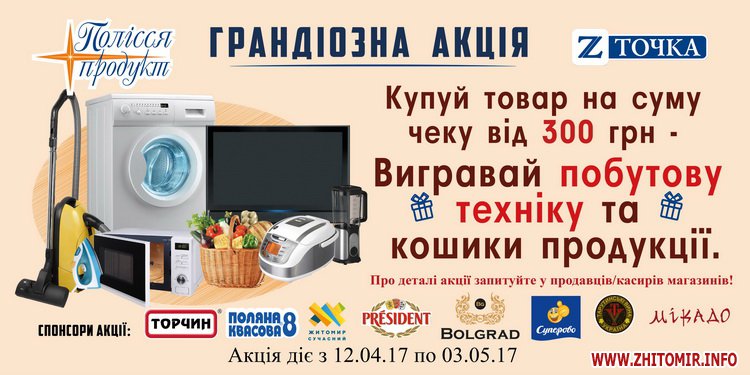 • 12.04.17-03.05.17 придбайте товар у будь-якому магазині «Полісся-Продукт» або «Z ТОЧКА» на суму від 300 грн. і більше одним чеком (в чеку обов’язково має бути продукція ТМ партнерів акції).