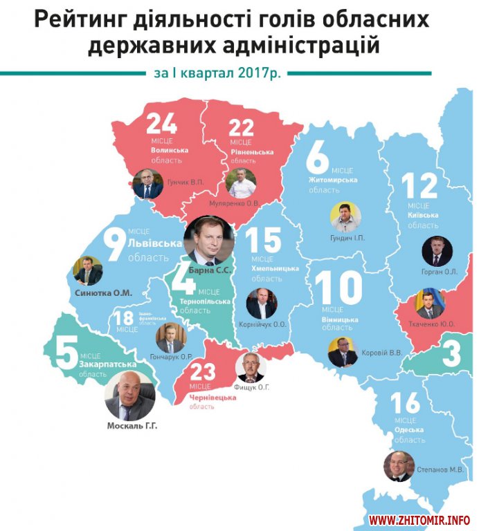 «Оцінка базувалася на двох критеріях: показниках соціально-економічного розвитку регіонів та опитуванні місцевих експертів. У першій п’ятірці рейтингу – голови Харківської, Донецької, Кіровоградської, Тернопільської та Закарпатської обласних державних адміністрацій. Порівняно з 2016 роком залишила групу лідерів Львівська ОДА. Середній результат (верхня частина) продемонстрували Житомирська, Сумська, Запорізька, Львівська, Вінницька, Миколаївська та Київська області. Нижня частина «середняків» – Дніпропетровська, Чернігівська, Хмельницька, Одеська, Луганська, Івано-Франківська та Полтавська області. Місця наприкінці рейтингу посіли Херсонська (Андрій Гордеєв), Черкаська (Юрій Ткаченко), Рівненська (Олексій Муляренко), Чернівецька (Олександр Фищук) та Волинська (Володимир Гунчик) області. На думку експертів, керівники областей, які посіли останні місця у рейтингу, найближчим часом можуть втратити свої посади, якщо суттєво не покращать результати», - зазначає КВУ.