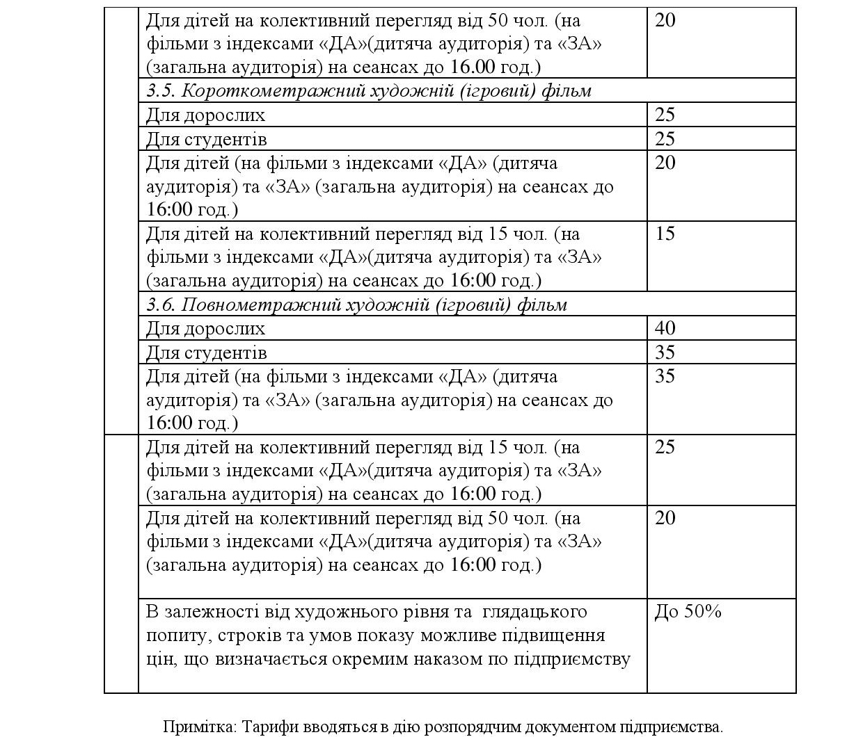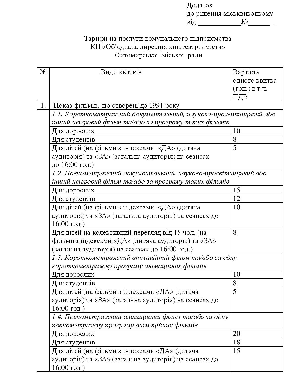 Нижче наводимо дані з додатку до проекту рішення «Про встановлення тарифів на послуги з демонстрування фільмів комунальному підприємству «Об’єднана дирекція кінотеатрів міста» Житомирської міської ради»