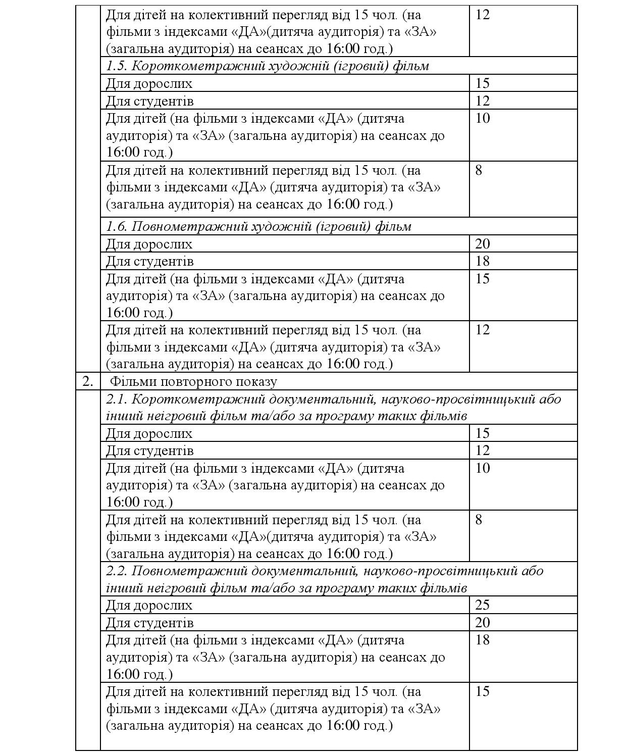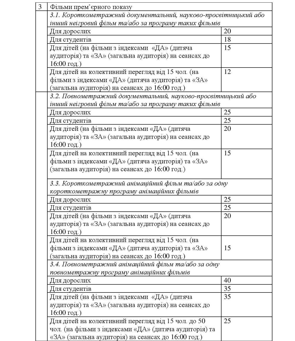 Так, пропонується встановити вартість одного квитка на повнометражні анімаційні фільми, створені до 1991 року, для дорослих 20 грн, для студентів – 18, для дітей – 15 грн, а для дітей на колективний перегляд (від 15 осіб) – 12 грн. Вартість квитків за показ повнометражних документальних, науково-просвітницьких або інших неігрових фільмів та/або за програму таких фільмів, створених до 1991 року, може становить 15 грн (для дорсолих), 12 грн (для студентів), 10 грн (для дітей), 8 грн (для дітей на колективний перегляд).