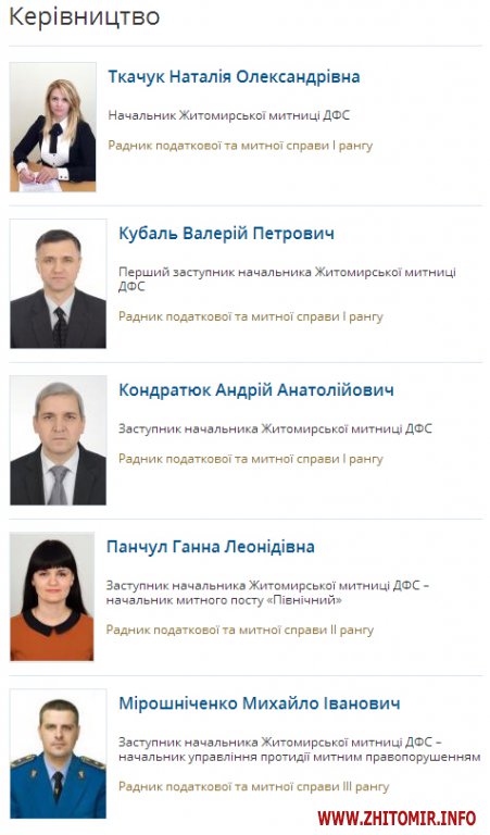 Як повідомляв Житомир.info, станом на 20 лютого цього року у начальника Житомирської митниці було три заступники: перший заступник Валерій Кубаль, заступник Андрій Кондратюк, заступник начальника – начальника митного посту «Північний» Ганна Панчул.
