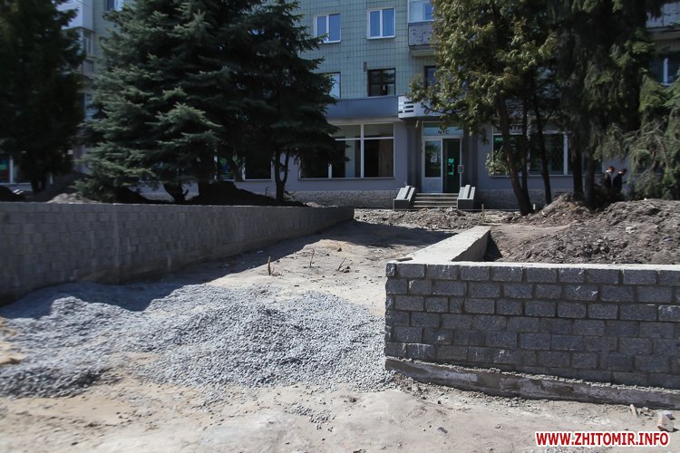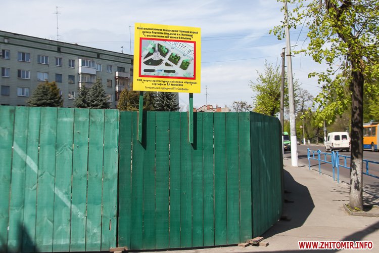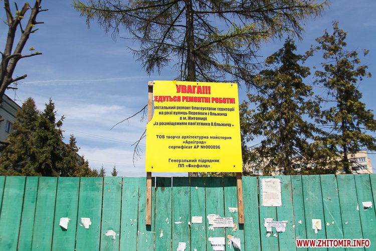 Нагадаємо, переможцем тендеру на проведення благоустрою території на розі вулиць Перемоги і Ольжича із розміщенням пам'ятника Олегу Ольжичу стала житомирська фірма «Скефалд», яка ремонтувала будинок після вибуху на колишній вулиці Щорса. Підрядник зобов’язався розібрати бетонне покриття та східці, демонтувати фундаменти й парапет, виконати земляні роботи, встановити сходи, турнікети, огорожу, 8 лавочок та 7 урн, а також підготувати місце для пам’ятника.
