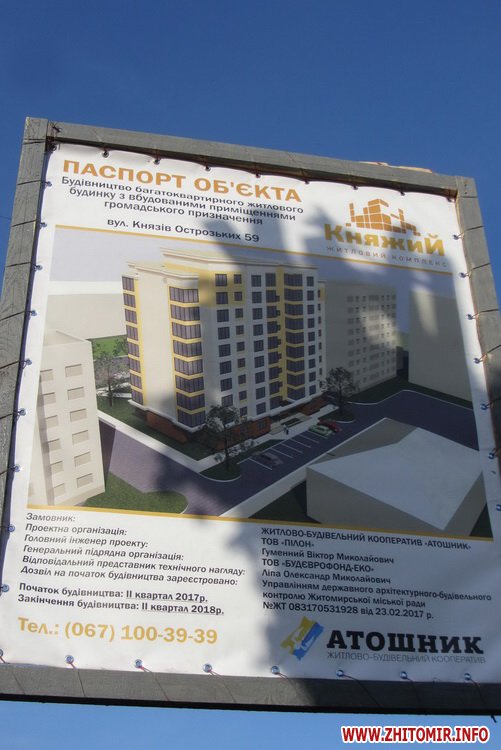 Нагадаємо, в 2015 році влада Житомира заговорила про безоплатну передачу землі по вулиці Князів Острозьких громадській організації «Атошник» для будівництва багатоповерхівки для учасників АТО. У березні 2016 року депутати міськради віддали земельну ділянку по вулиці Князів Острозьких, 59 під будівництво ЖБК «Атошник». Тоді на сесії мер Житомира Сергій Сухомлин пояснював депутатам, що половину квартир в цьому будинку віддадуть учасникам АТО, а другу половину – продадуть задля здешевлення їх вартості для бійців.