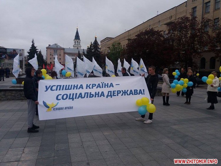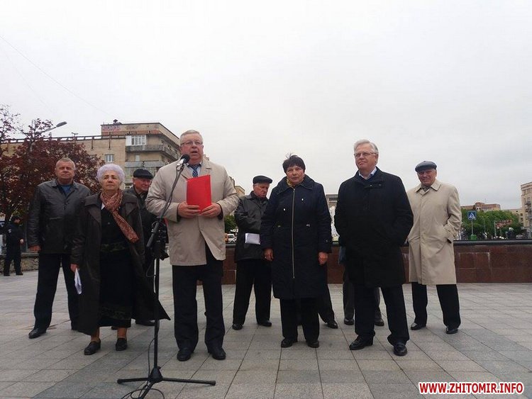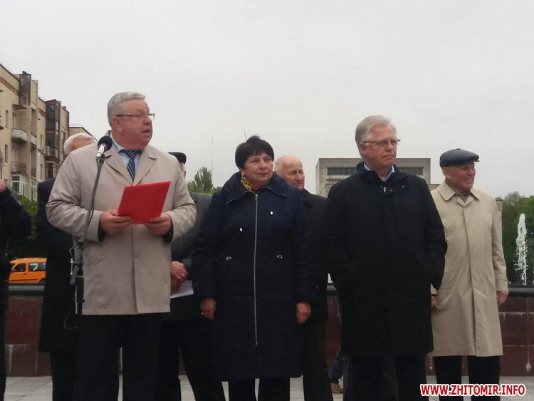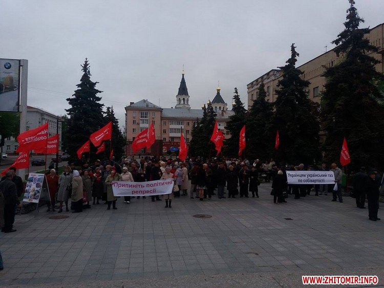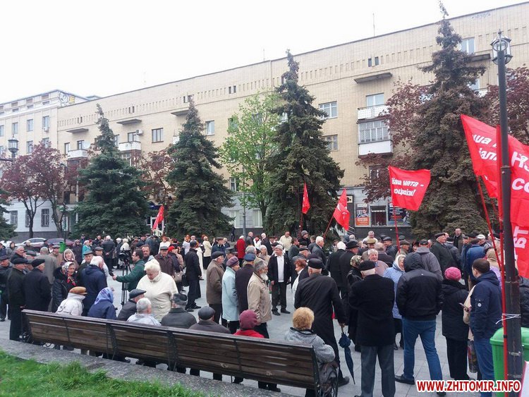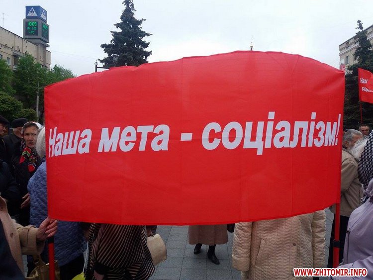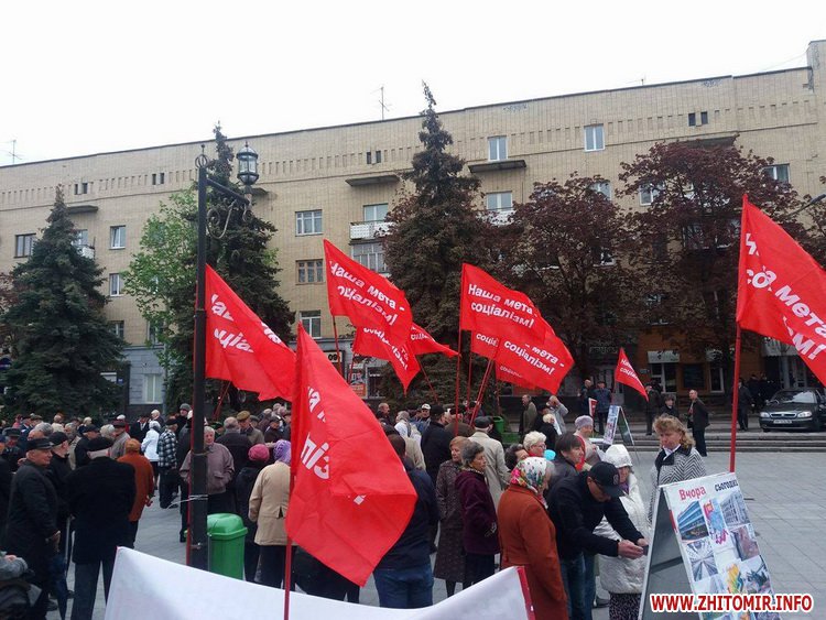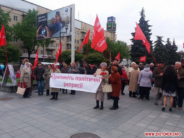 На майдані Соборному 1 травня о 10:00 більше сотні житомирян зібралися з плакатами та червоними прапорами. Також до обласного центру приїхав лідер забороненої Компартії Петро Симоненко.