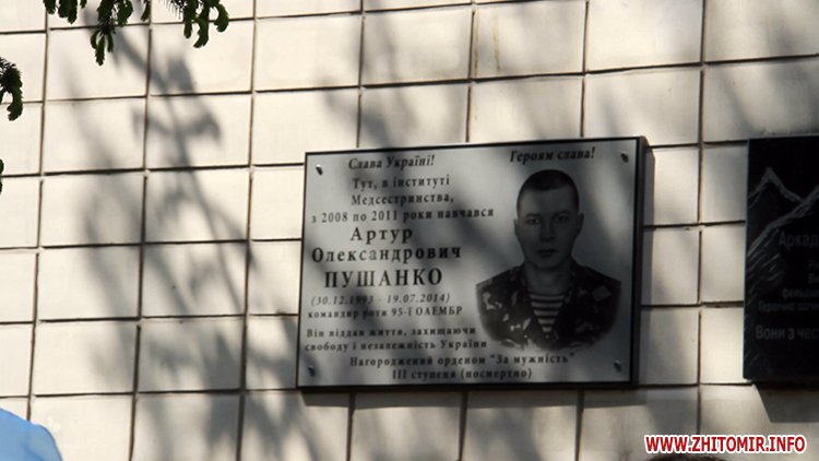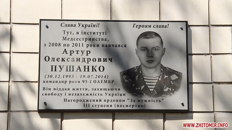Як повідомляв Житомир.info, десантник 95-ї бригади Артур Пушанко загинув 19 липня 2014 року під Лисичанськом Луганській області у 20-річному віці. Прощання із ним відбулося 24 липня у військовій частині на Корбутівці, а поховали Героя на Смолянському кладовищі у Житомирі. Меморілаьну дошку бійцю планували спочатку, у серпні 2014-го, встановити на фасаді будинку, де він проживав, – по вулиці Ватутіна (після перейменування – проспект Незалежності), 39 у Житомирі. А вже у квітні 2016 року на сайті міськради з’явився проект рішення «Про надання згоди Комунальному вищому навчальному закладу «Житомирський інститут медсестринства» на встановлення меморіальної дошки Пушанку Артуру Олександровичу», за яким дошку й встановили на фасаді навчального закладу.