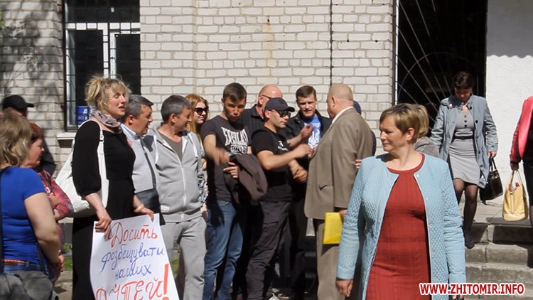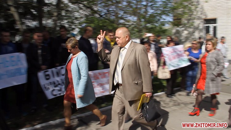 Під вигуки мітингувальників екс-директор Бердичівського медичного коледжу Володимир Клименюк 4 травня заходить у приміщення Житомирського районного суду, де оскаржує рішення сесії обласної ради про звільнення його з посади.