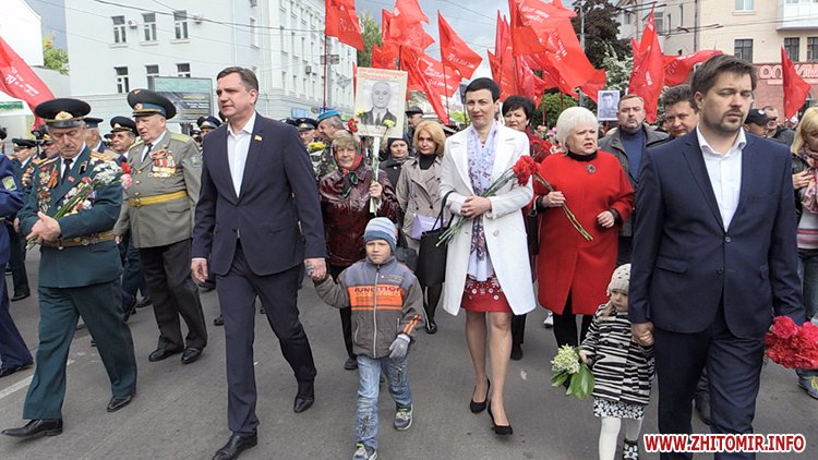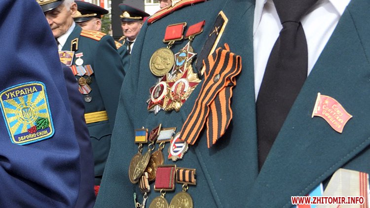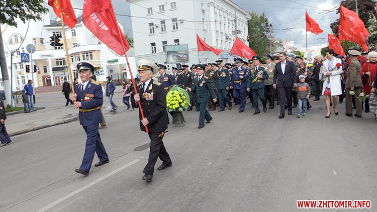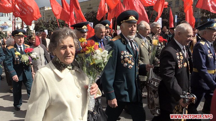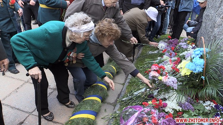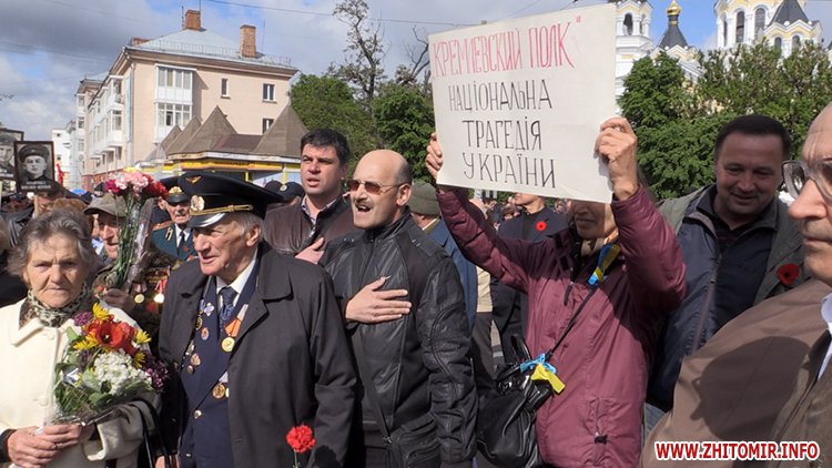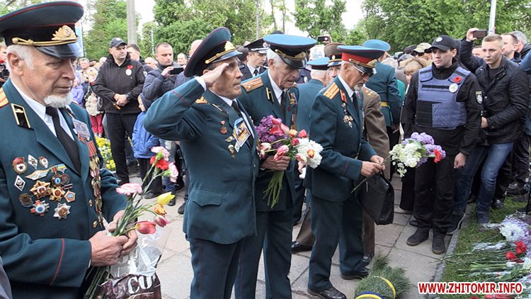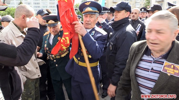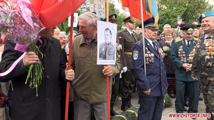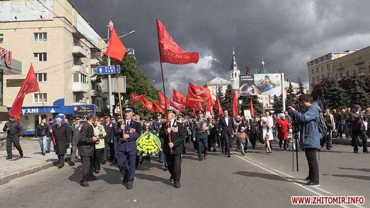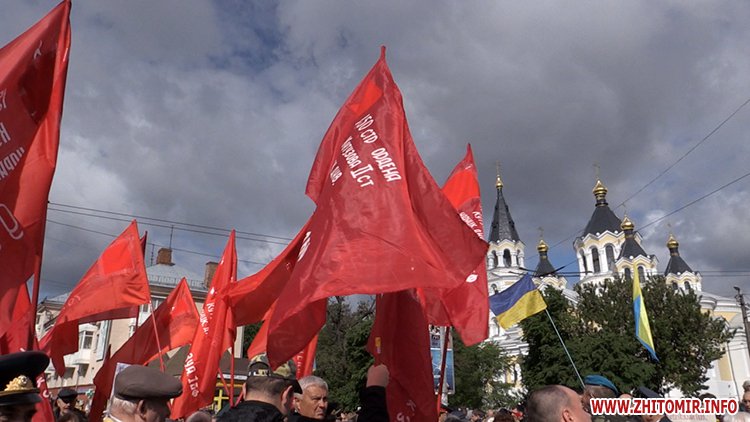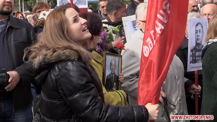 9 травня на майдані Перемоги, біля танку, зібралося кілька сотень житомирян, ветерани та громадські активісти: одні, тримаючи у руках червоні прапори, співають пісню «День Победы», інші, з блакитно-жовтим стягом, виконують Гімн України та вигукують патріотичні гасла.