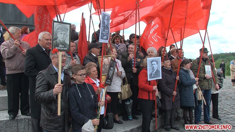 Нагадаємо, вранці на майдані Перемоги ветеранів примусили згорнути прапор із комуністичною символікою, після чого розпочалися урочистості з нагоди 72-ї річниці перемоги над нацизмом у Другій світовій війні: житомиряни колоною пройшли від центру міста до монументу Слави.