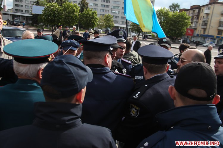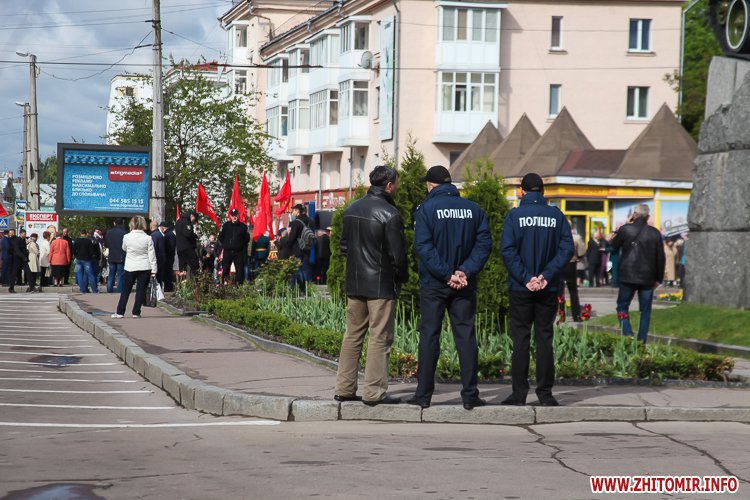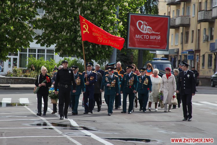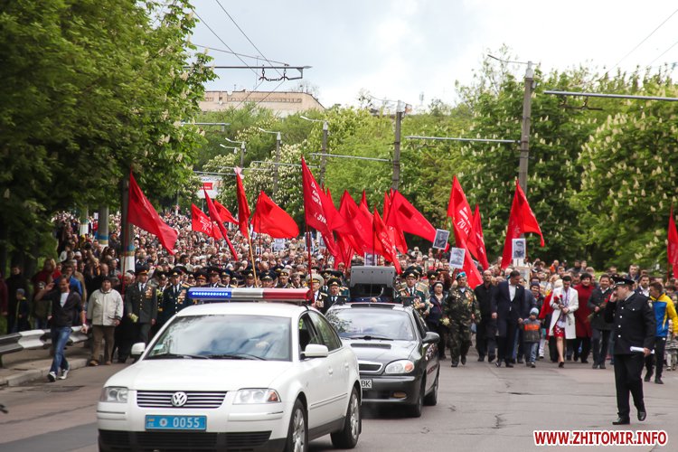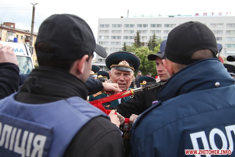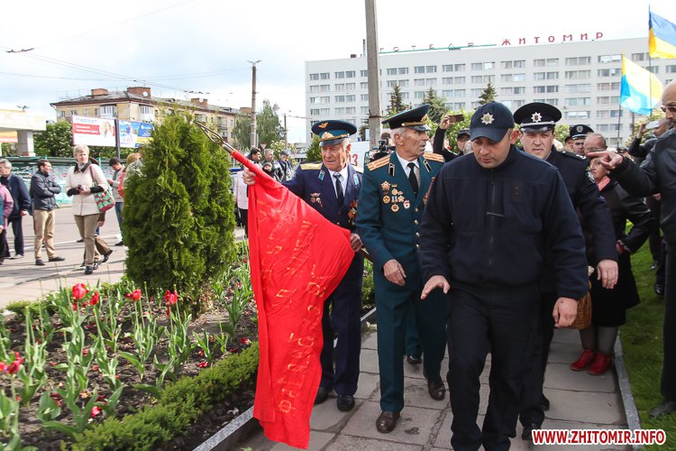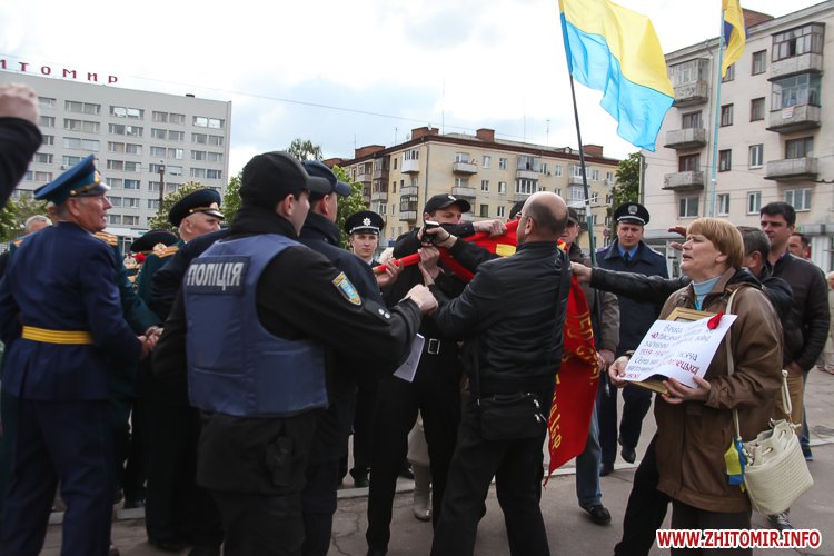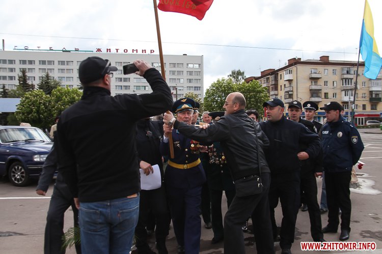 Як повідомляв Житомир.info, 9 травня святкування у Житомирі почалося з конфлікту на майдані Перемоги, біля монументу Слави об 11.00 почався мітинг-реквієм з нагоди 72-ї річниці перемоги над нацизмом у Другій світовій війні, в якому взяли участь близько 4 тисяч житомирян.