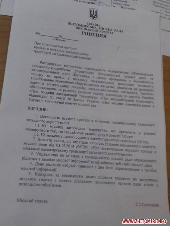 Як повідомляв Житомир.info, питання збільшення до 5 гривень вартості проїзду в міських маршрутках розглядали на позачерговому засіданні виконкому 17 березня цього року, але його відклали через лист Антимонопольного комітету і непідписання перевізниками додаткових пунктів до угод. Згодом заступник мера Дмитро Ткачук на брифінгу заявив, що перевізниками була зареєстрована заява про оголошення страйку: вони з 20 березня не виїдуть на маршрути і не будуть їх обслуговувати, якщо тариф не підніметься до 5 грн. Ввечері 19 березня перевізники повідомили, що страйку не буде і всі маршрутки виїдуть. Після цього Ткачук розповів про домовленості з перевізниками: вони мають усунути недоліки, до яких мав претензії АМКУ, підписати додаткові угоди, якими зобов’яжуться встановити валідатори та оновити рухомий склад, і лише тоді питання розглянуть на засіданні виконавчого комітету - не раніше квітня.